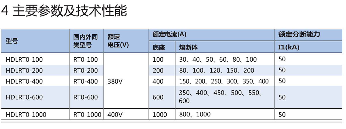 HDLRT0系列刀型触头熔断器适用于交流45Hz~62Hz,额定电压至400V,额定电流至1000A,额定分断能力至50kA的配电线路中的过载保护和短路保护。