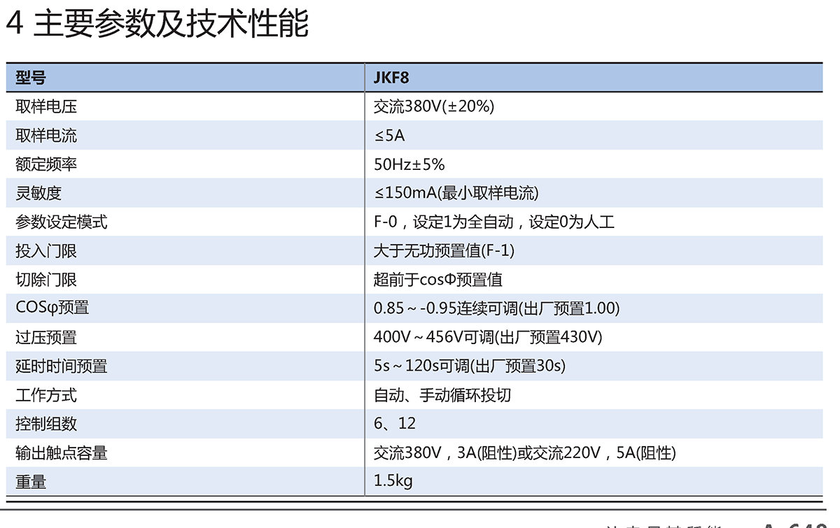 JKF8系列智能型低压无功补偿控制器与低压并联电容屏装置配套,适用于额定电压380V、交流、50Hz的配电系统中,控制并联电容器自动投切,改善电压质量,减少电能损失。
