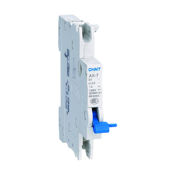 AX-7辅助触头主要用于交流50Hz,约定发热电流至3A,交流额定电压至415V或直流额定电压至125V的线路中,与NB7小型断路器拼装,作远距离断路器通断的信号指示之用。