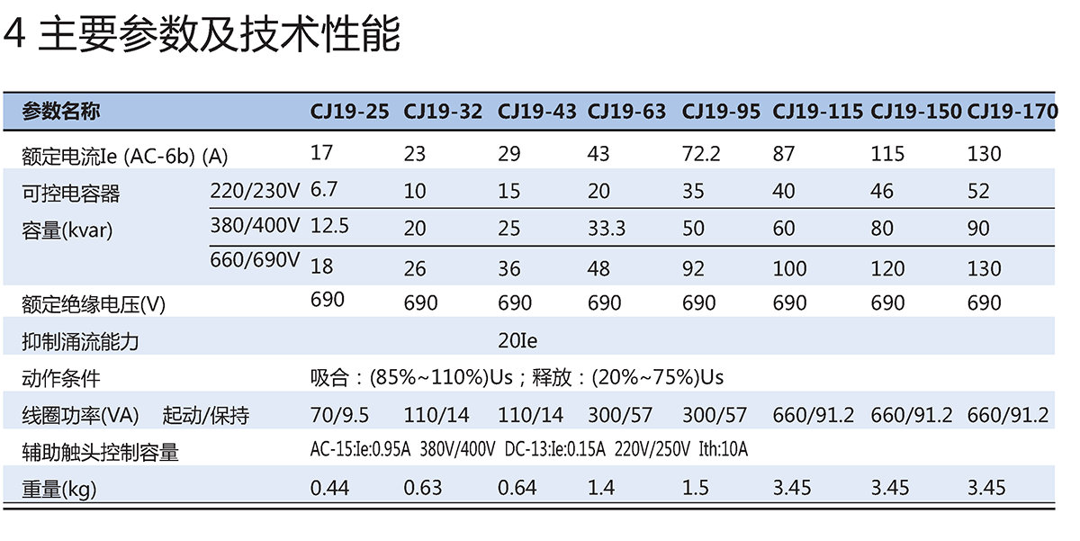 CJ19系列切换电容器接触器(以下简称接触器)主要用于交流50Hz(或60Hz)、额定工作电压至690V的电力线路中,供低压无功功率补偿设备投入或切除低压并联电容器之用。接触器带有抑制涌流装置,能有效地减小合闸涌流对电容的冲击和抑制开断时的过电压。