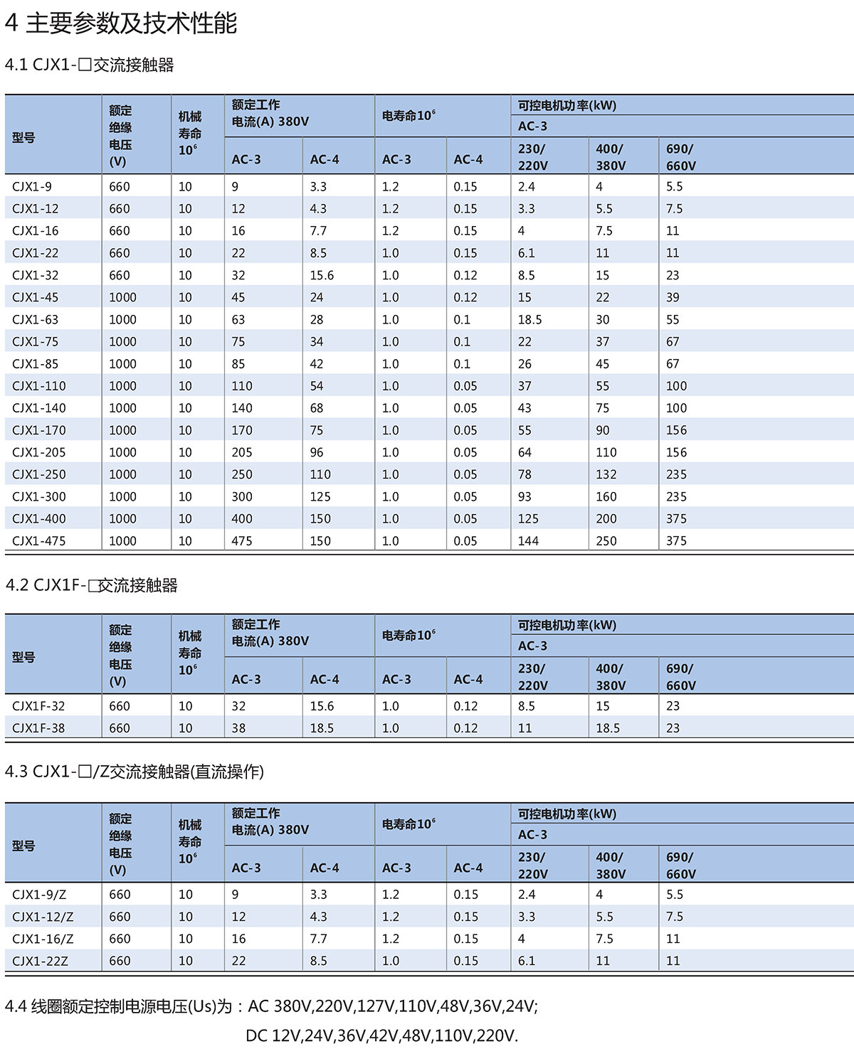 CJX1系列交流接触器主要用于交流50Hz或60Hz,额定绝缘电压为660V~1000V,在AC-3使用类别下额定工作电压为380V时额定工作电流为9A~475A的电力线路中。作为供远距离接通和分断电路之用,并适用于控制交流电动机的起动、停止及反转。