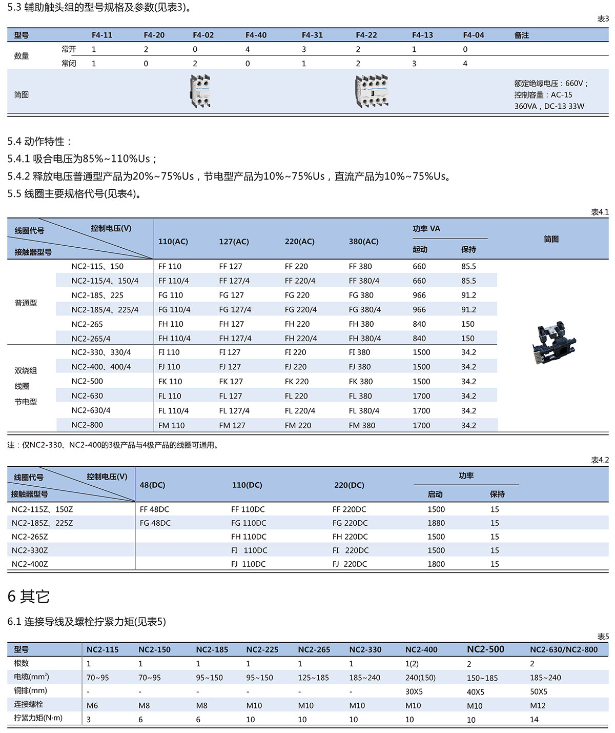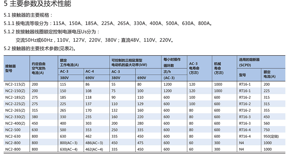 NC2系列交流接触器(以下简称接触器),主要用于交流50Hz或60Hz,额定工作电压至690V,额定工作电流至800A的电路中,供远距离接通和分断电路之用,并可与适当的热过载继电器组成电磁起动器,以保护可能发生操作过负荷的电路。