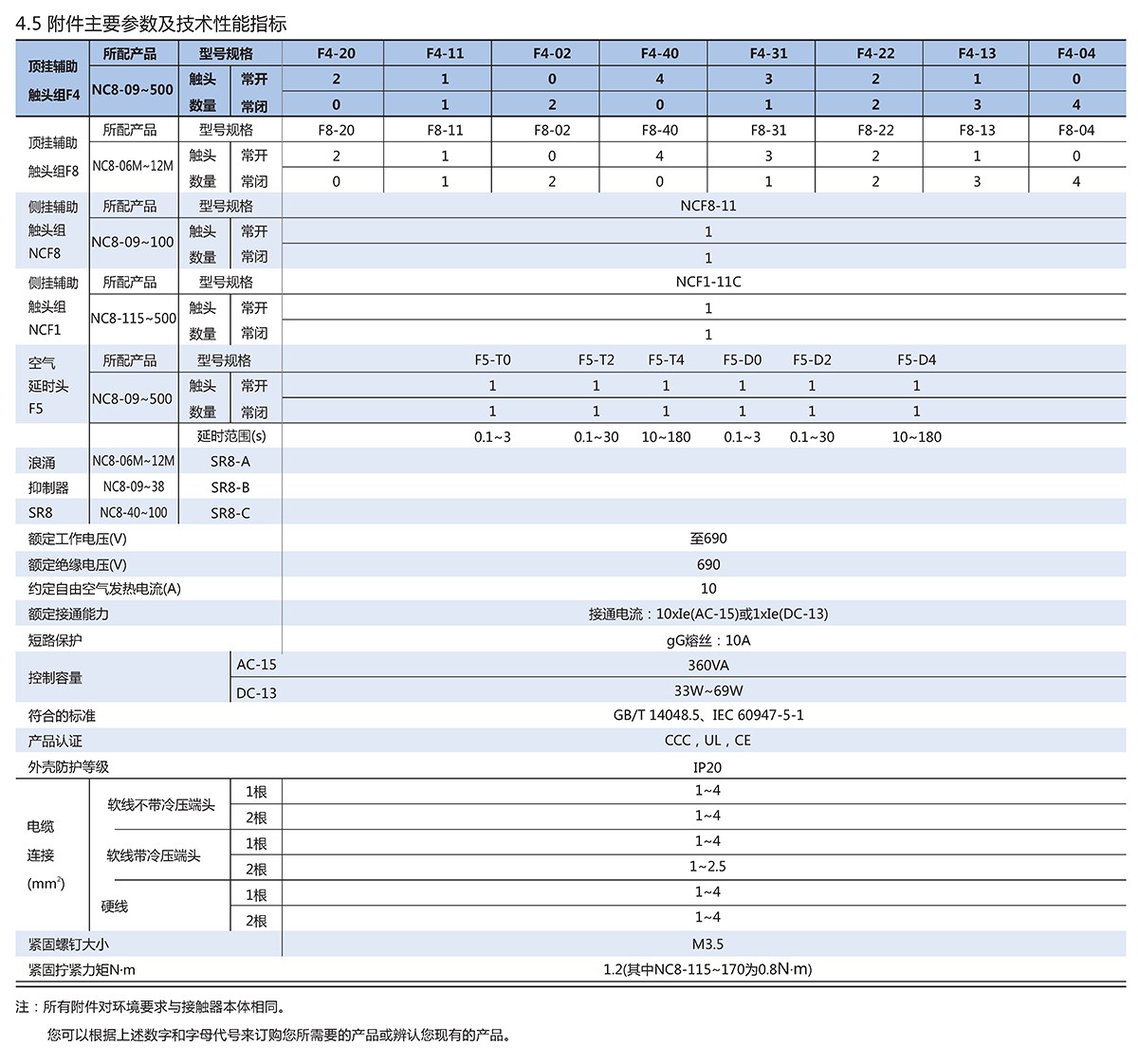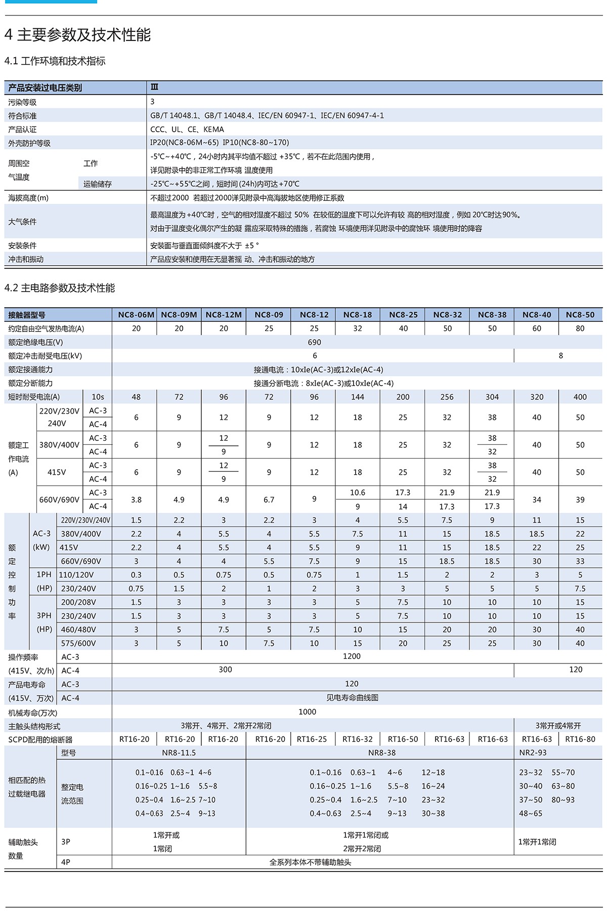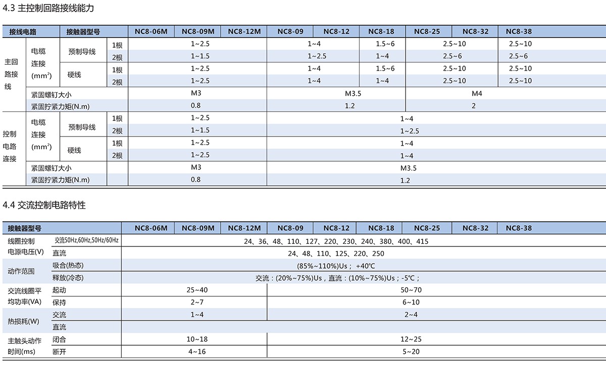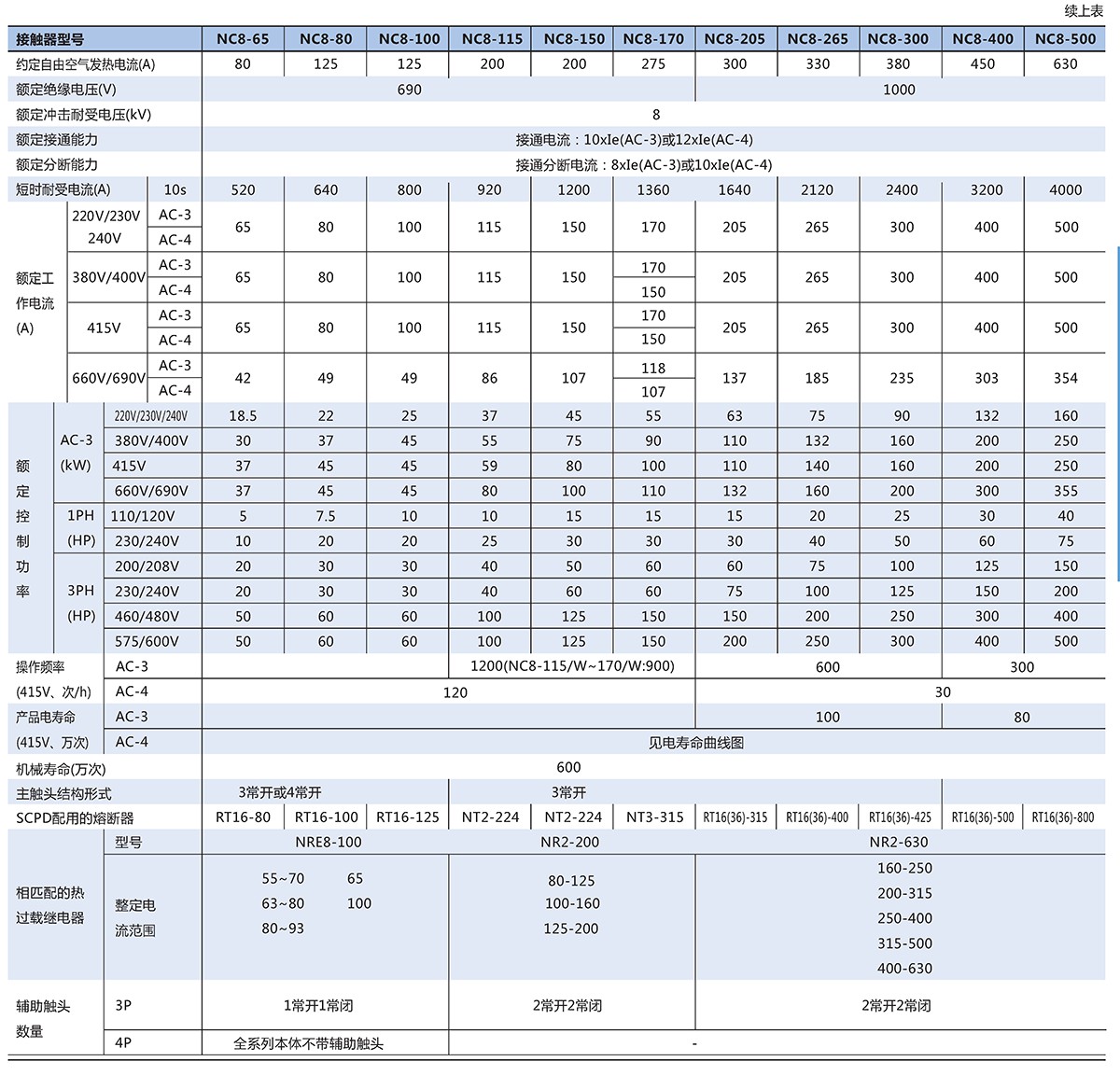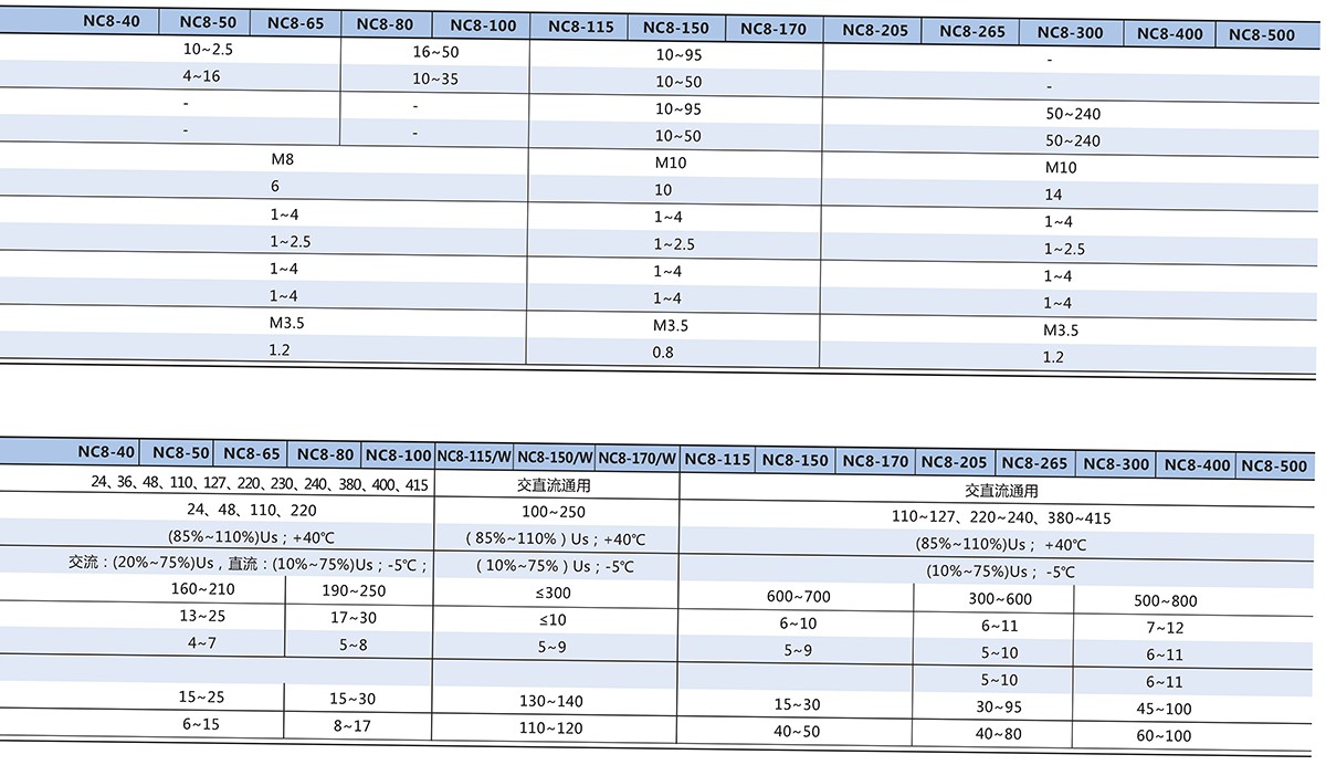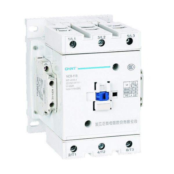 NC8系列交流接触器(以下简称接触器),主要用于交流50Hz(或60Hz),额定工作电压至690V, 在AC-3/415V使用类别下额定工作电流至500A的电路中,供远距离接通和分断电路之用,并可与适当的热过载继电器组成电磁起动器以保护可能发生操作过负荷的电路,接触器适宜于频繁地起动和控制交流电动机。