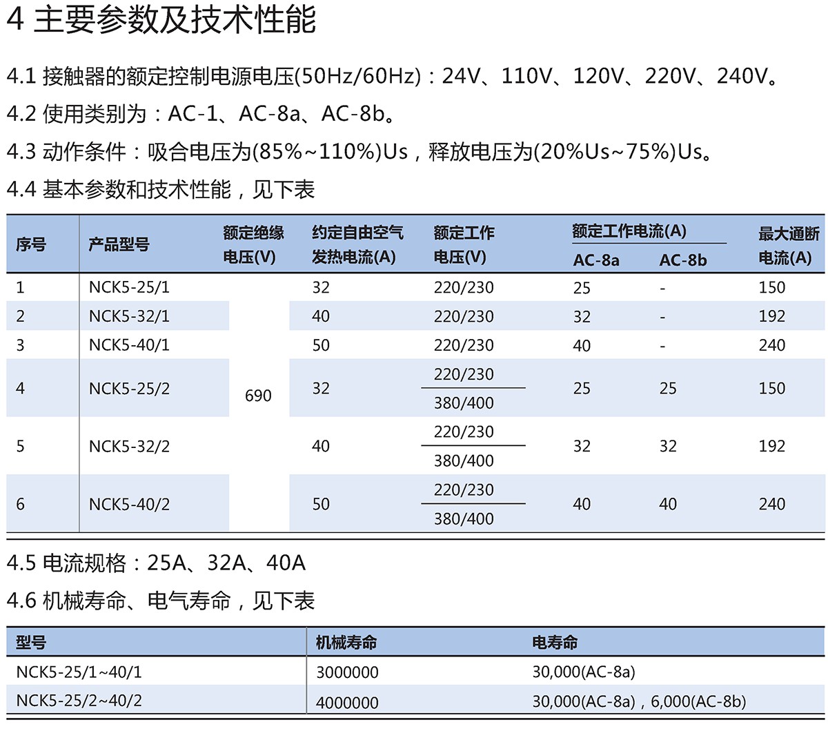 NCK5-25/1~40/1接触器主要用于交流电压至230V,电流至40A的电路中,作为接通和分断电路之用。