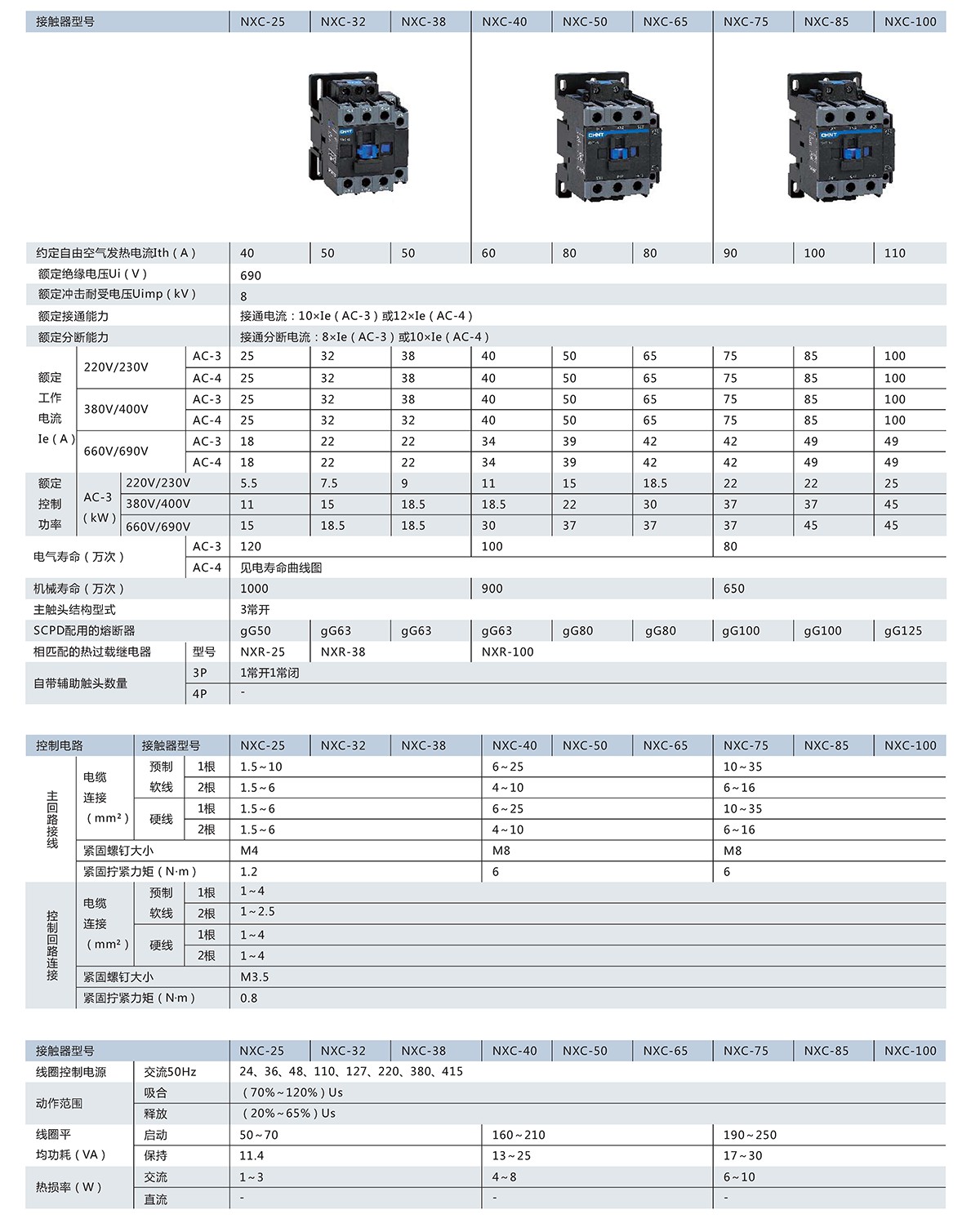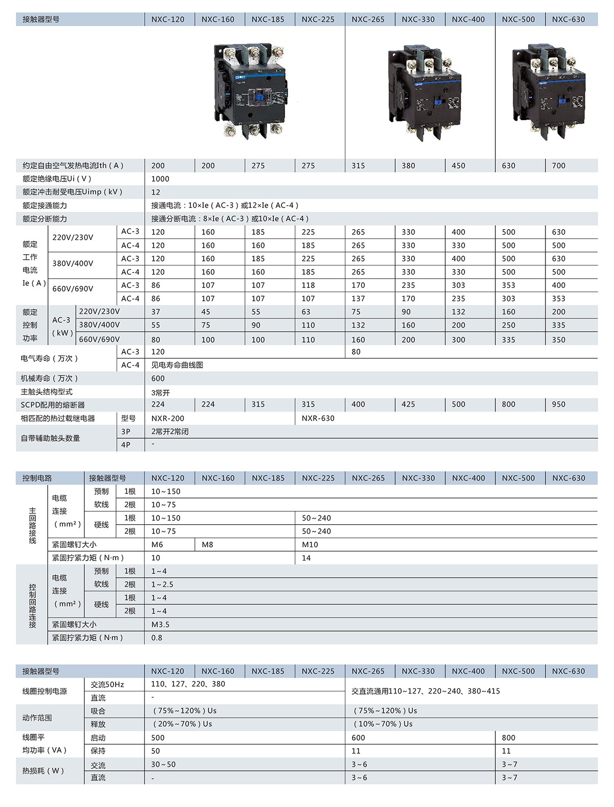 全新的NXC系列交流接触器,外观新颖,结构紧凑。主要用于频繁地起动和控制交流电动机,远距离接通和分断电路,并可与适当的热过载继电器组成电磁起动器。