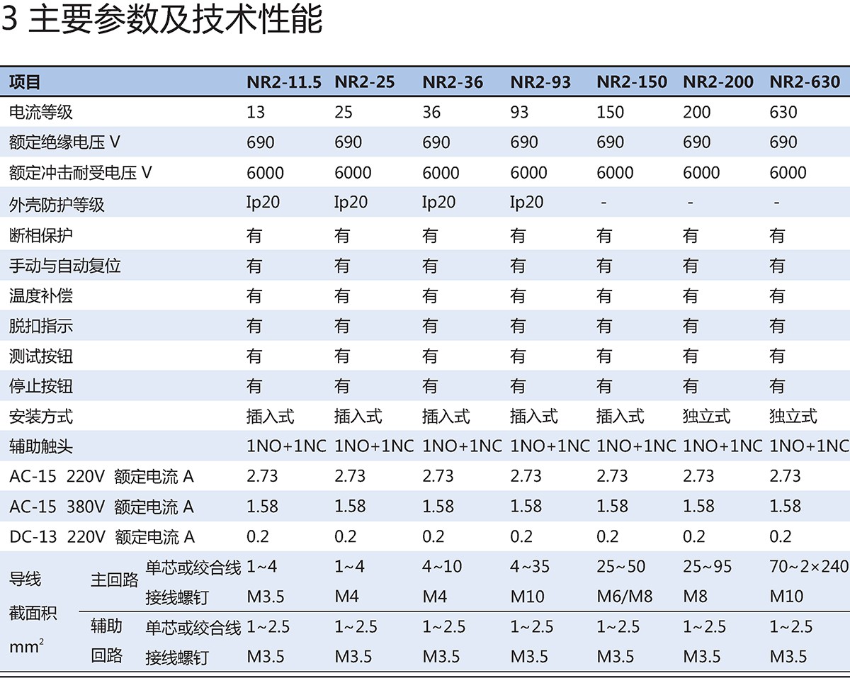NR2系列热过载继电器(以下简称热继电器)适用于交流 50Hz/60Hz、电压至 690V,电流(0.1-630)A的长期工作或间断长期工作的交流电动机的过载与断相保护。