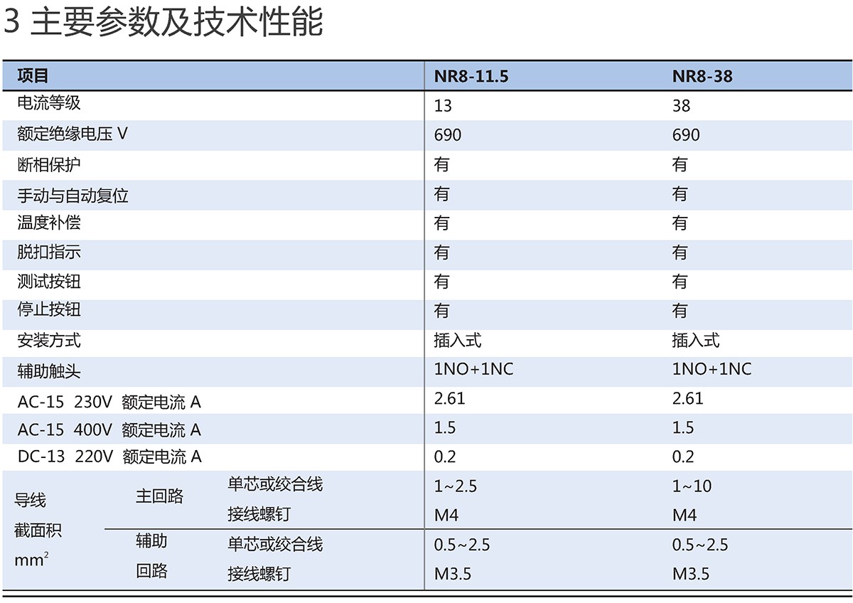 NR8系列热过载继电器(以下简称热继电器)适用于交流 50Hz/60Hz、电压至 690V,电流0.1A~38A的长期工作或间断长期工作的交流电动机的过载与断相保护。
