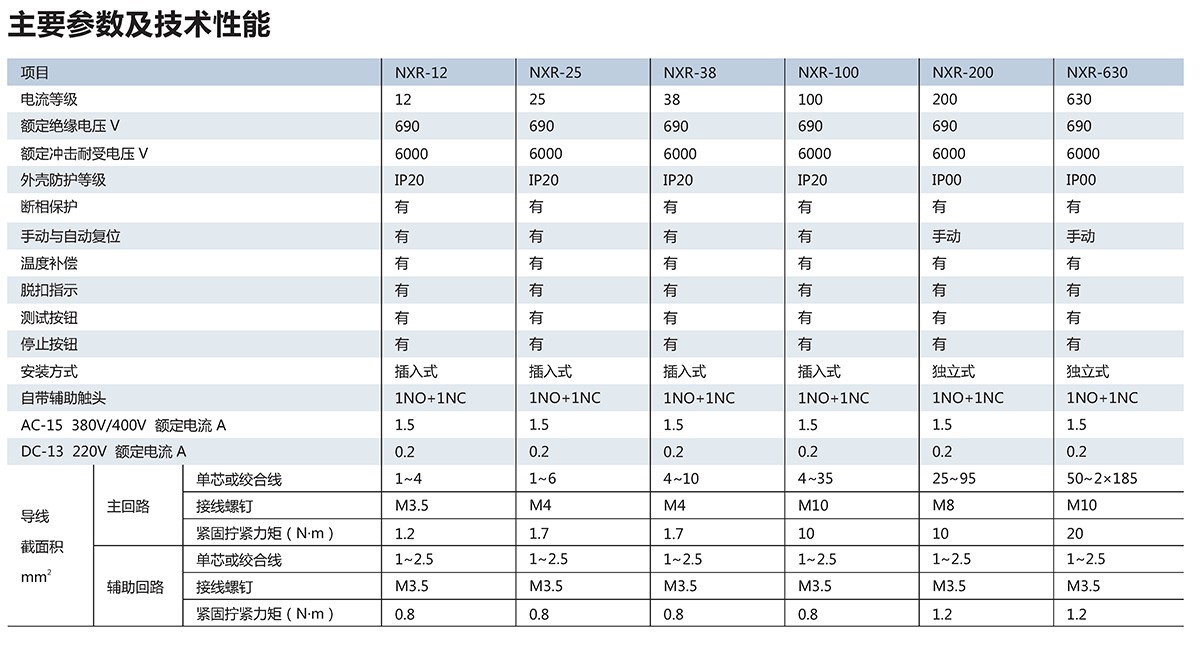 NXR系列热过载继电器(以下简称热继电器)适用于交流50Hz/60Hz、电压至 690V、整定电流0.1~630A的长期工作或间断工作的交流电动机的过载与断相保护。