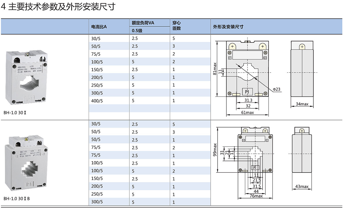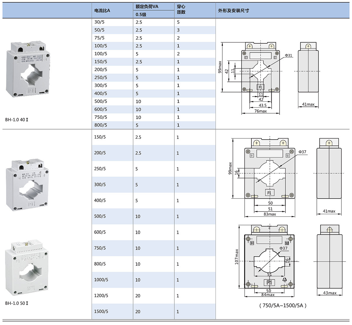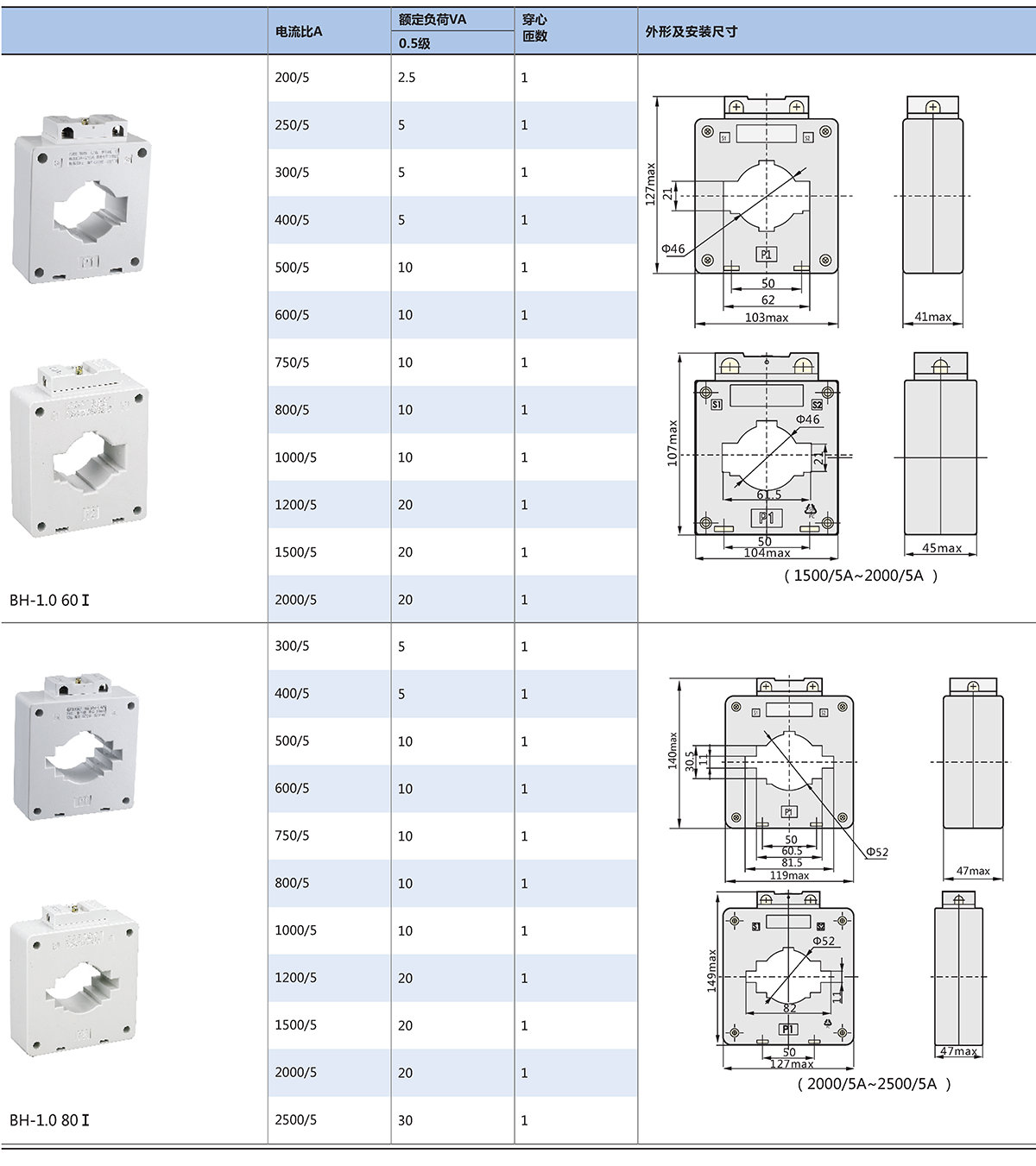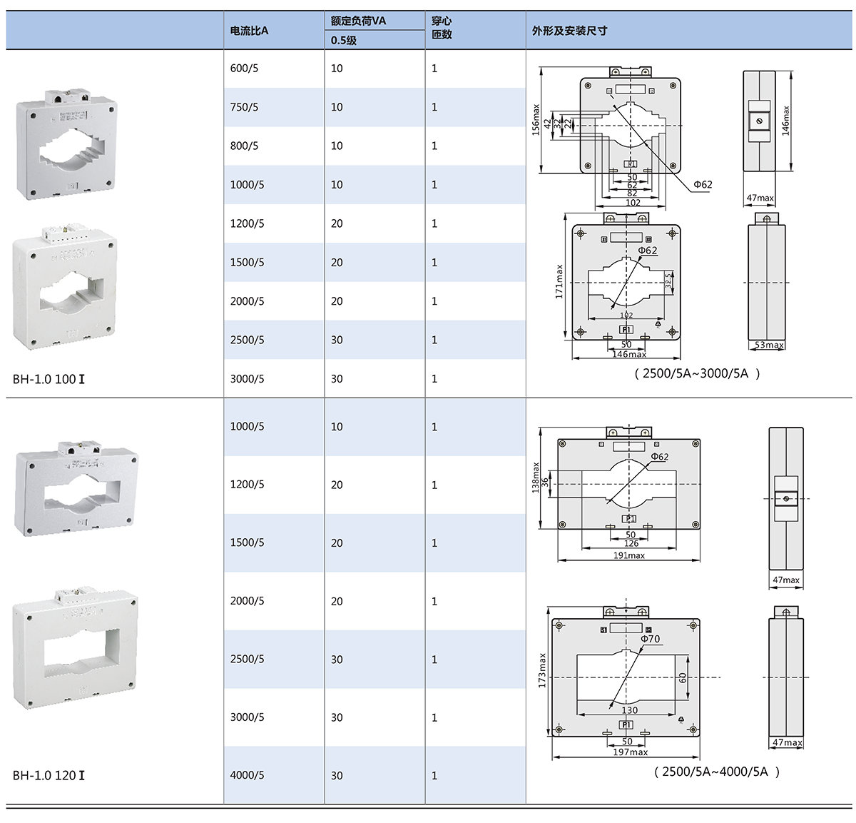 BH-1.0 型电流互感器主要用于户内,供额定电压为1.0kV及以下,额定频率为50Hz的交流电路中作为电流、电能测量或继电保护用。产品为塑壳式电流互感器,广泛应用于成套柜体,其安装方法可采用母排固定和底板固定安装方法,适合水平或垂直安装,一次导线可为母排或电缆。