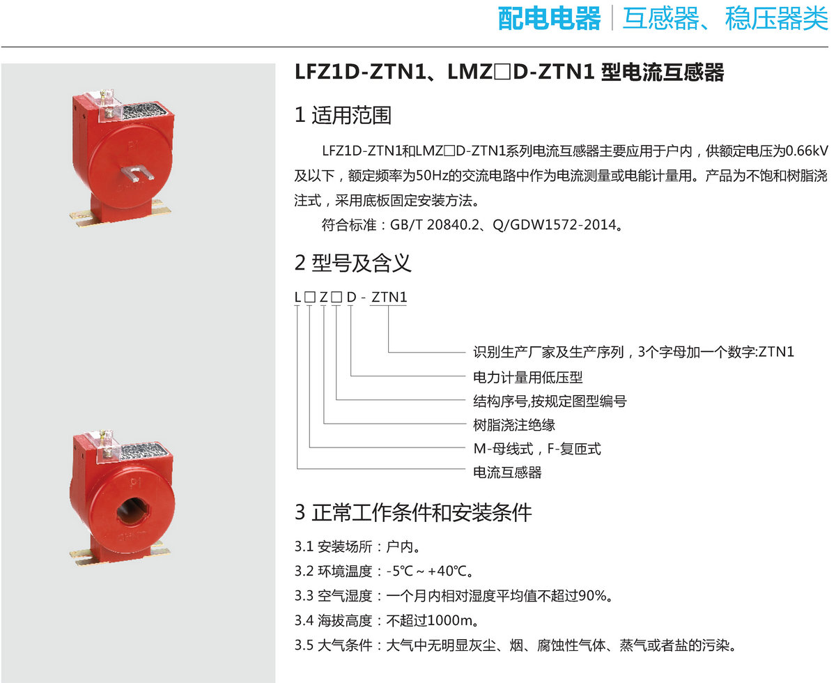 LFZ1D-ZTN1和LMZ□D-ZTN1系列电流互感器主要应用于户内,供额定电压为0.66kV及以下,额定频率为50Hz的交流电路中作为电流测量或电能计量用。产品为不饱和树脂浇注式,采用底板固定安装方法。