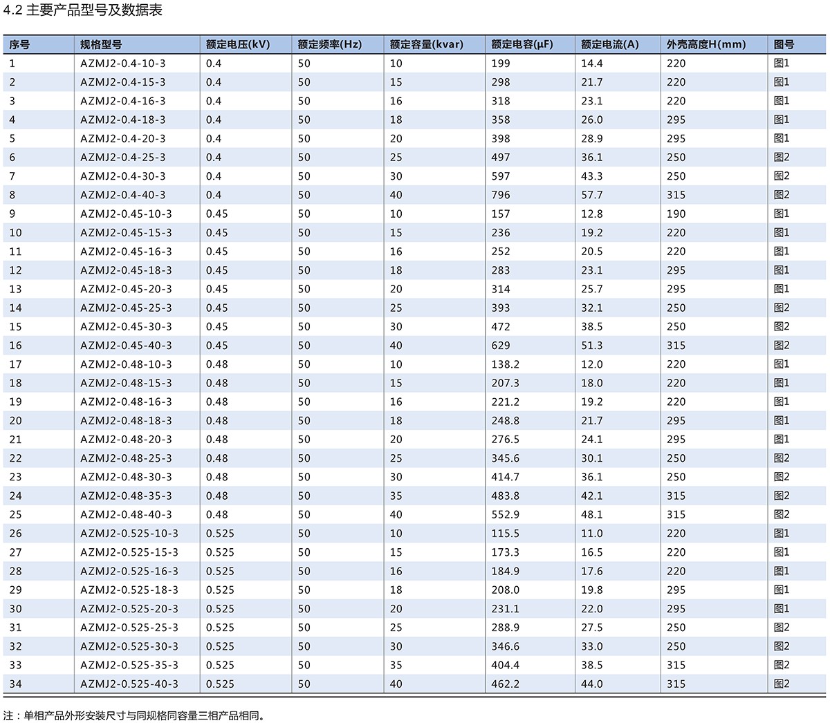 高耐受谐波,无功补偿用(加强型电容器)。利用AZMJ2滤波电容器能够耐受较大谐波电流的特点,在电网谐波电流总畸变率THD1<30%的环境中,以之替换普通的电力电容器,作为抗谐型电容器使用,如替代同规格的BZMJ、NWC1、NWC5等系列产品,解决少部分用户因电网谐波电流放大而造成电容器使用寿命不长的问题。与BZMJ同规格产品相比理论寿命大致延长一倍以上。