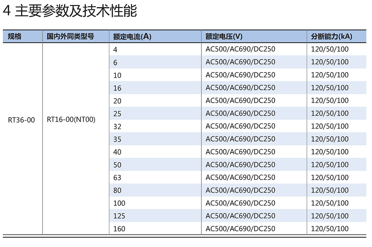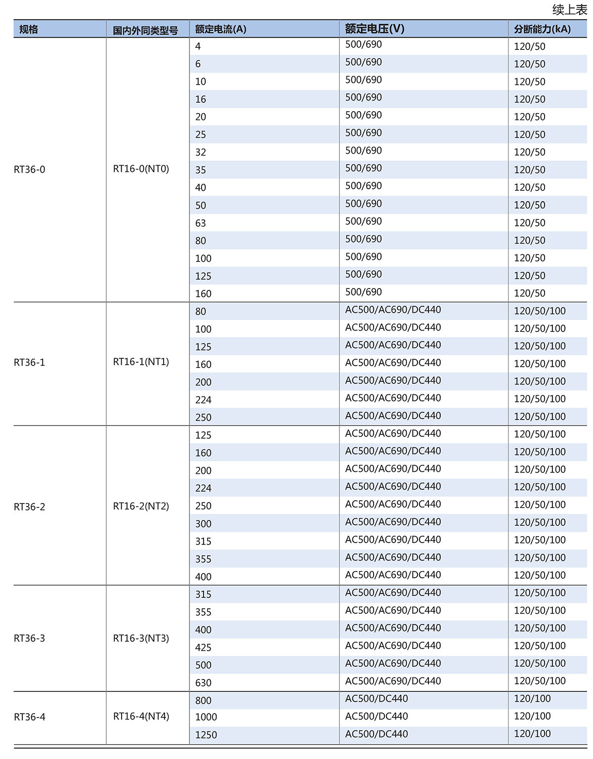 RT36系列熔断器当用于电容柜系统保护时,选型熔断器≤63A时,选用RT36-00产品;选型熔断器>63A,≤160A时,选用RT36-1产品;选型熔断器>160A,≤300A时,选用RT36-2产品;选型熔断器>300A时,选用RT36-3产品。