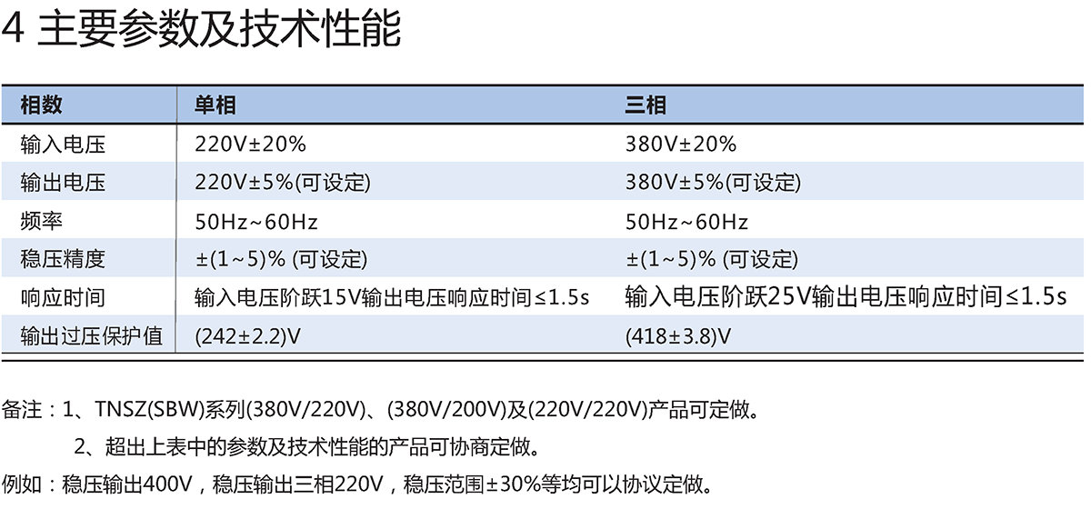 TNDZ(DBW)/TNSZ(SBW)系列柱式交流自动稳压器分为单相TNDZ(DBW型)、三相TNSZ(SBW型)二种,与其它形式稳压器相比具有容量大、效率高、电压调节平稳。适用负载广泛,能承受瞬时超载,可长期连续工作,设有过压、短路保护功能,使用安装方便,运行可靠等特点。可广泛应用于工业、农业、交通、邮电、军事、铁路、科研文化等领域的大型机电设备、金属加工设备、生产流水线,建筑工程设备、电梯、医疗器械、微机机房、电脑控制设备、刺绣轻纺设备、空调、广播电视、宾馆及家用电器照明等需要稳压的场所。