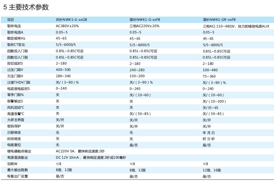 NWK1系列中文液晶低压无功补控制器采用手机菜单操作模式,实现人机交换,适用于电网的配电监测和共补、分补兼顾的无功补偿。它采用ASIC处理芯片,通过FFT(快速傅立叶计算)对采集的三相电压和三相电流进行计算和分析,故在电网有较大的谐波分量下,能够正常以无功功率作为投切电容器的依据,并结合功率因数进行投切。电容容量可按循环、编码或任意值组合,进行对单相或三相电容的匹配或投切,实现最优的补偿效果,是我公司新推出的新一代智能无功补偿控制器。
