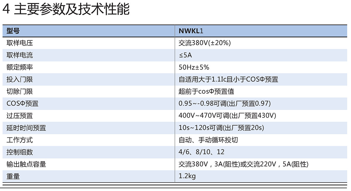 NWKL1系列智能型低压无功补偿控制器与低压并联电容屏装置配套,适用于额定电压380V、交流、50Hz的配电系统中,控制并联电容器自动投切,改善电压质量,减少电能损失。