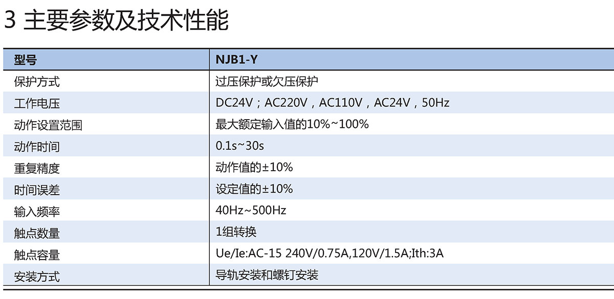 NJB1-Y单相电压继电器适用于交流电压220V、110V、24V,频率50Hz及直流电压24V的控制电路中作为单相过电压保护或欠电压保护、指示元件,按预定的动作值和时间接通或分断电路。