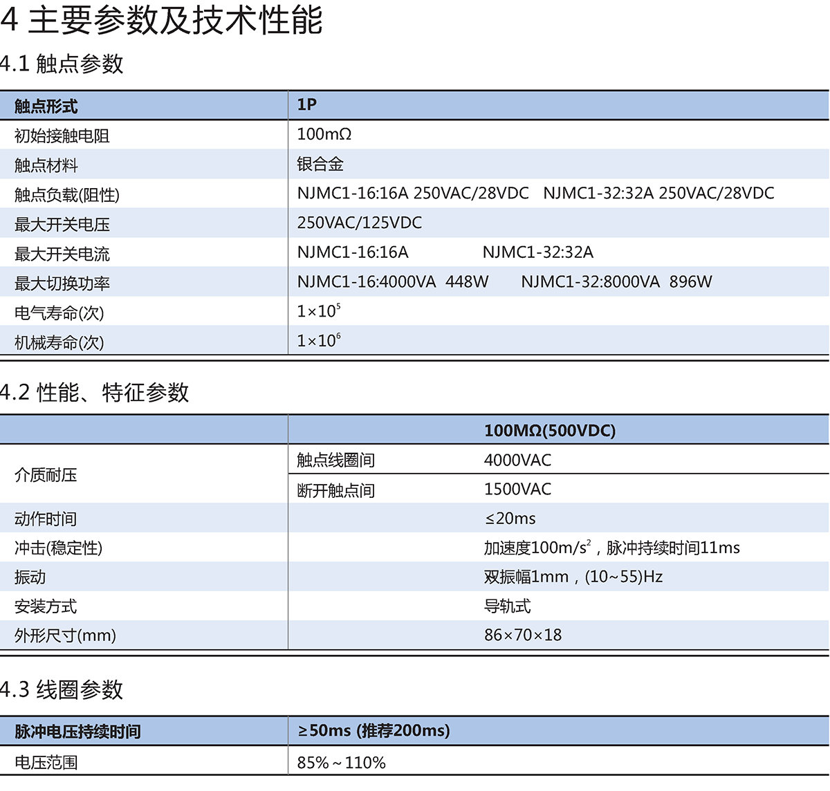 触点切换电流可达16A、32A;交、直流规格齐全;符合GB/T 21711.1标准的要求;NJMC1脉冲继电器是机械式的双稳态继电器,通过输入脉冲信号,改变触点的状态。因此与普通继电器在衔铁闭合时要持续通电相比,脉冲继电器具有低功耗的特点。