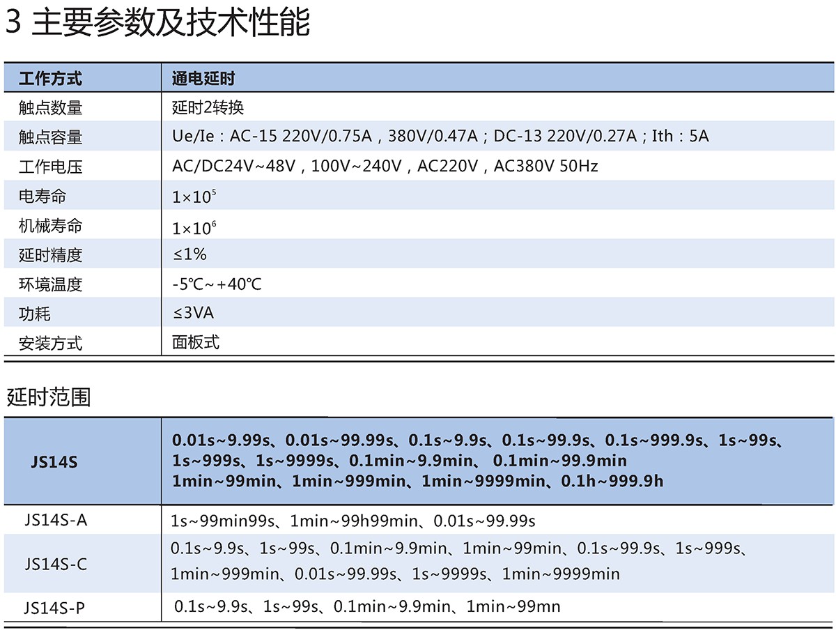 JS14S系列时间继电器适用于交流50Hz,额定控制电源电压至380V及直流控制电源电压至240V的控制电路中作延时元件,按预定的时间接通或分断电路。