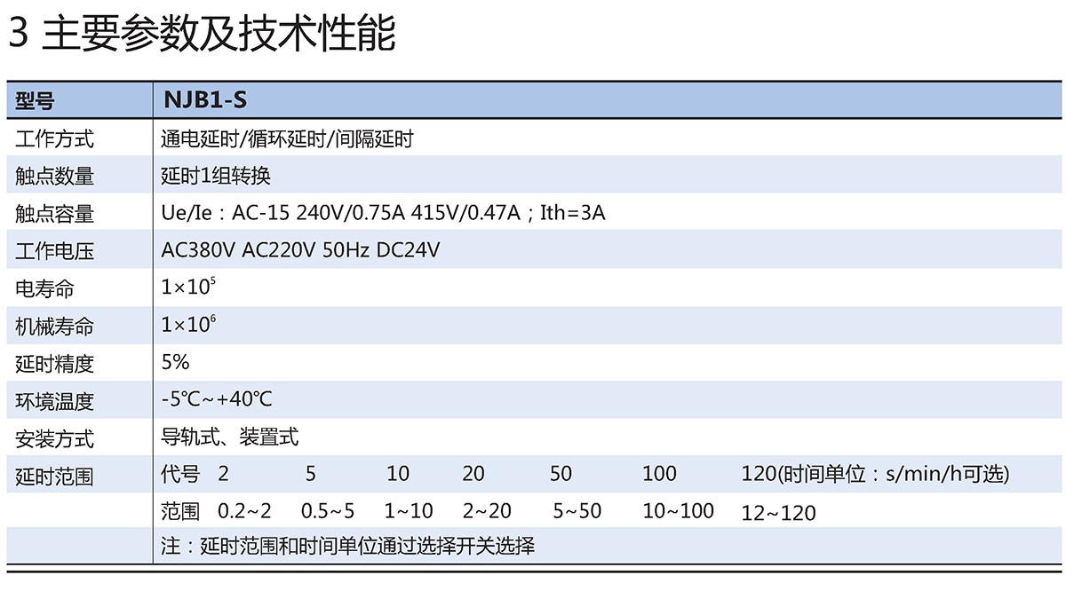 NJB1-S系列时间继电器适用于交流50Hz,额定控制电源电压至380V及直流控制电源电压至24V的控制电路中作时间控制、指示元件,按预定的时间接通或分断电路。
