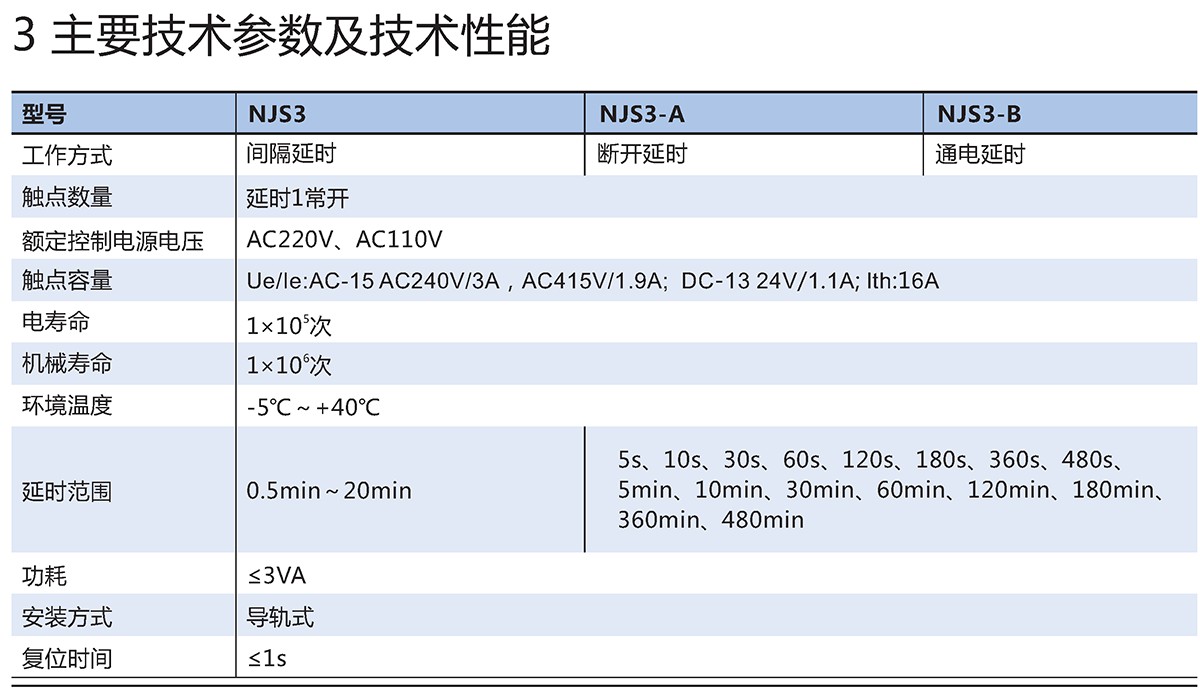 NJS3系列时间继电器主要用于交流频率50Hz,额定控制电源电压至220V的控制电路中作为时间控制元件,按预定的时间接通或分断电路。