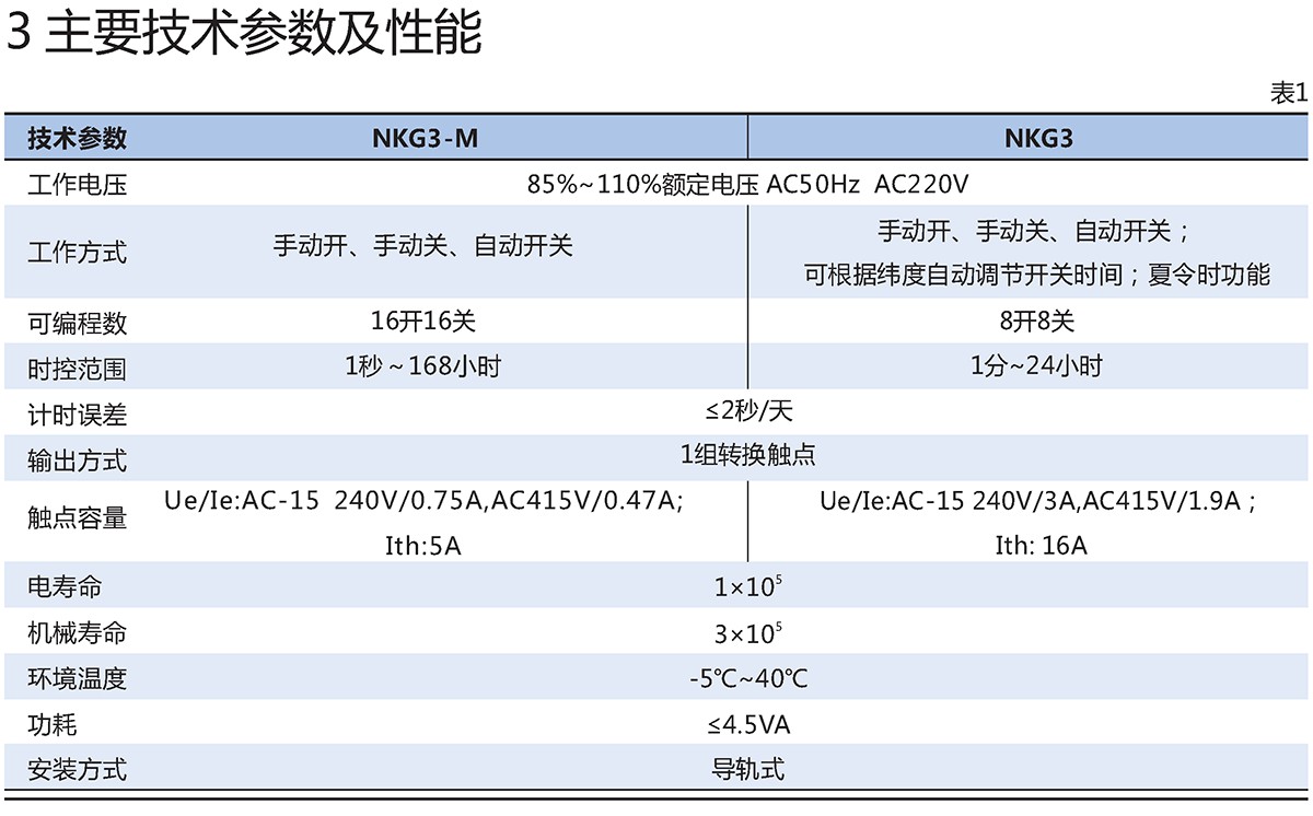 NKG3系列时控开关(以下简称时控开关),主要用于交流50Hz,额定控制电源电压至220V及以下的电路中作为时间控制元件,按预定的程序接通或断开电路之用。例如:作为路灯、广告灯箱等设备的定时接通或断开控制之用。
