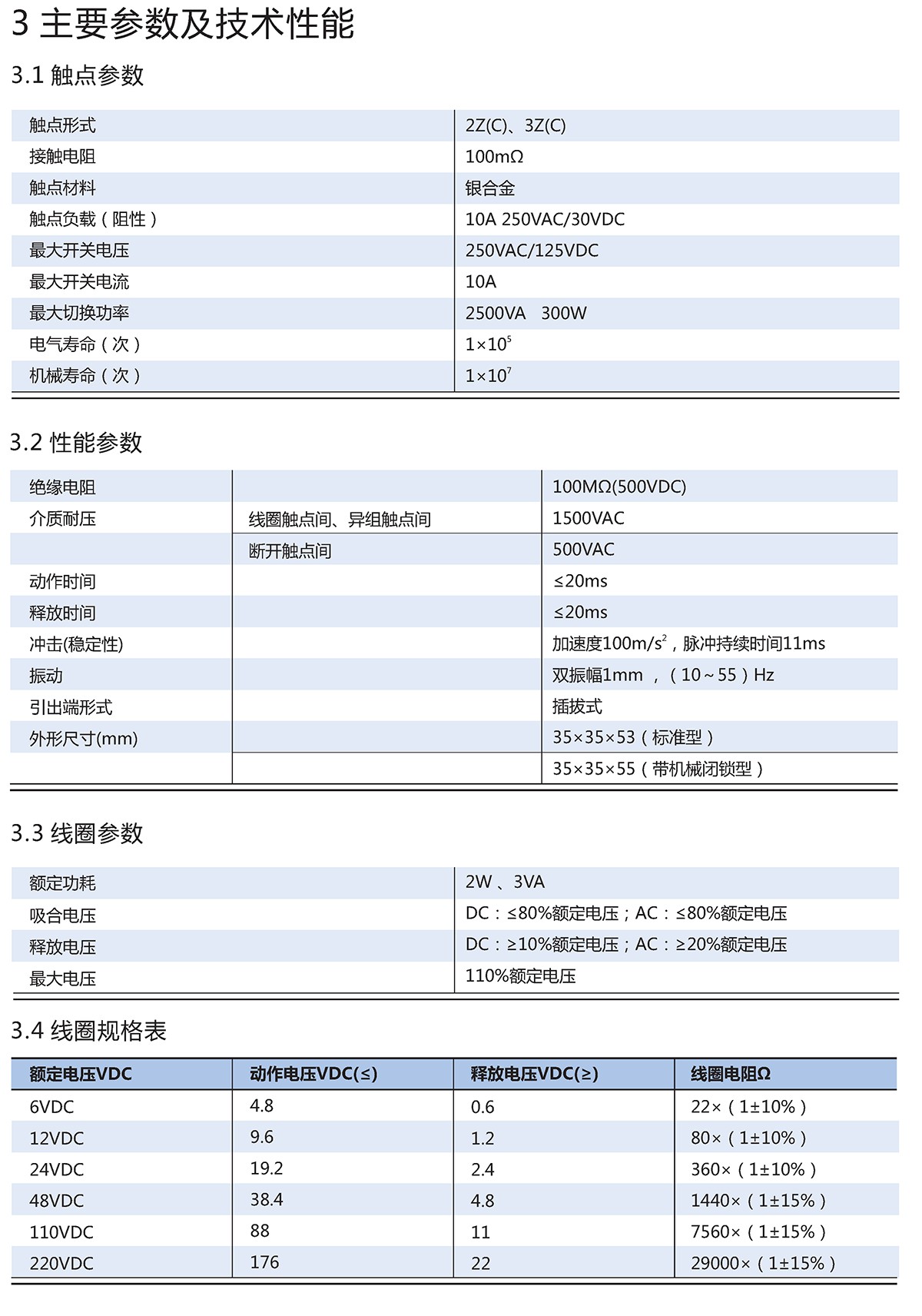 2Z、3Z两种触点形式;触点切换电流可达10A;交、直流规格齐全;备有多种装置式插座选用;具有机械闭锁、通电指示、机械指示功能供选择;产品通过CQC、CE认证。