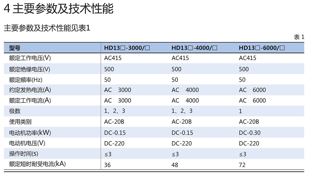HD13、HS13系列大电流刀开关(以下简称刀开关),分为电动式(附带手动)和手动式两种,是我公司自行研制的新型产品,适用于交流50Hz,额定电压380V或直流220V,额定电流3000A~6000A,主要用于配电设备的控制电路中,作不频繁地电动接通和切断或隔离电源之用,操作应在无负荷下进行,不得作为直接启动单台电动机之用。