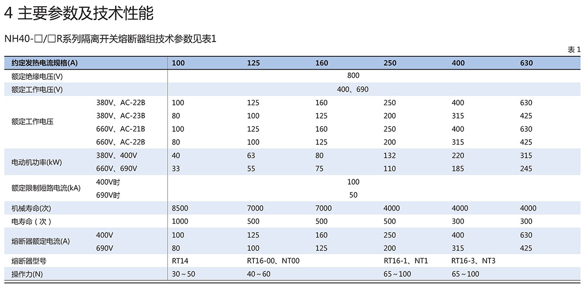 NH40-□/□R系列隔离开关熔断器组(以下简称开关)。是我公司自行研制的新产品。该产品适用于交流50/60Hz,额定电压AC为660V及以下、DC为440V及以下,额定电流至630A,开关主要使用在具有高短路电流的配电电路和电动机电路中,作为手动不频繁操作的主开关或总开关,不适合作为直接启动和断开单台电动机之用。
