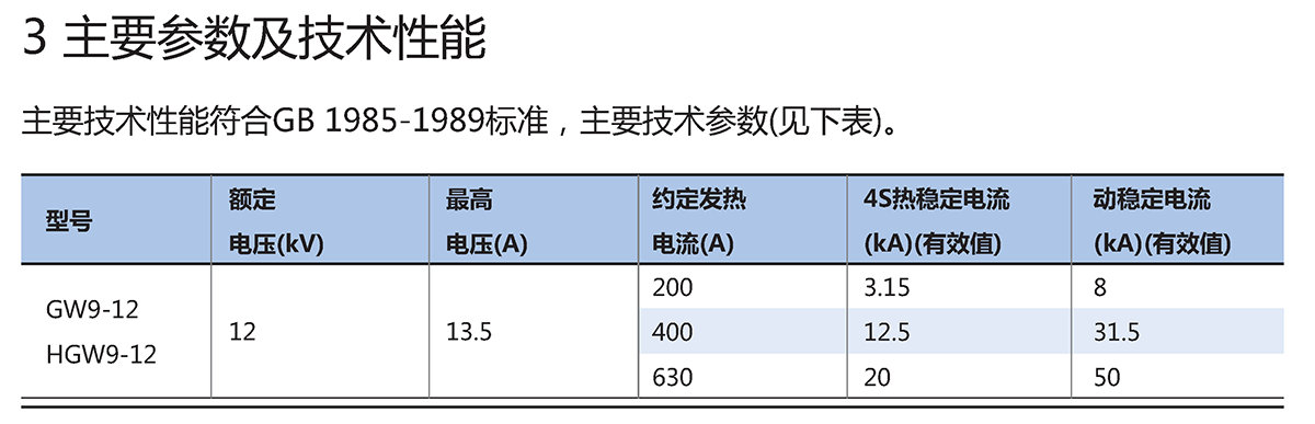 GW9、GW9-12H型户外单极隔离开关(以下简称开关)适用于交流频率50Hz,额定电压12kV及以下,额定电流630A及以下的配电线路上,用以接通和隔离无负载有电压的单相或三相电路。
