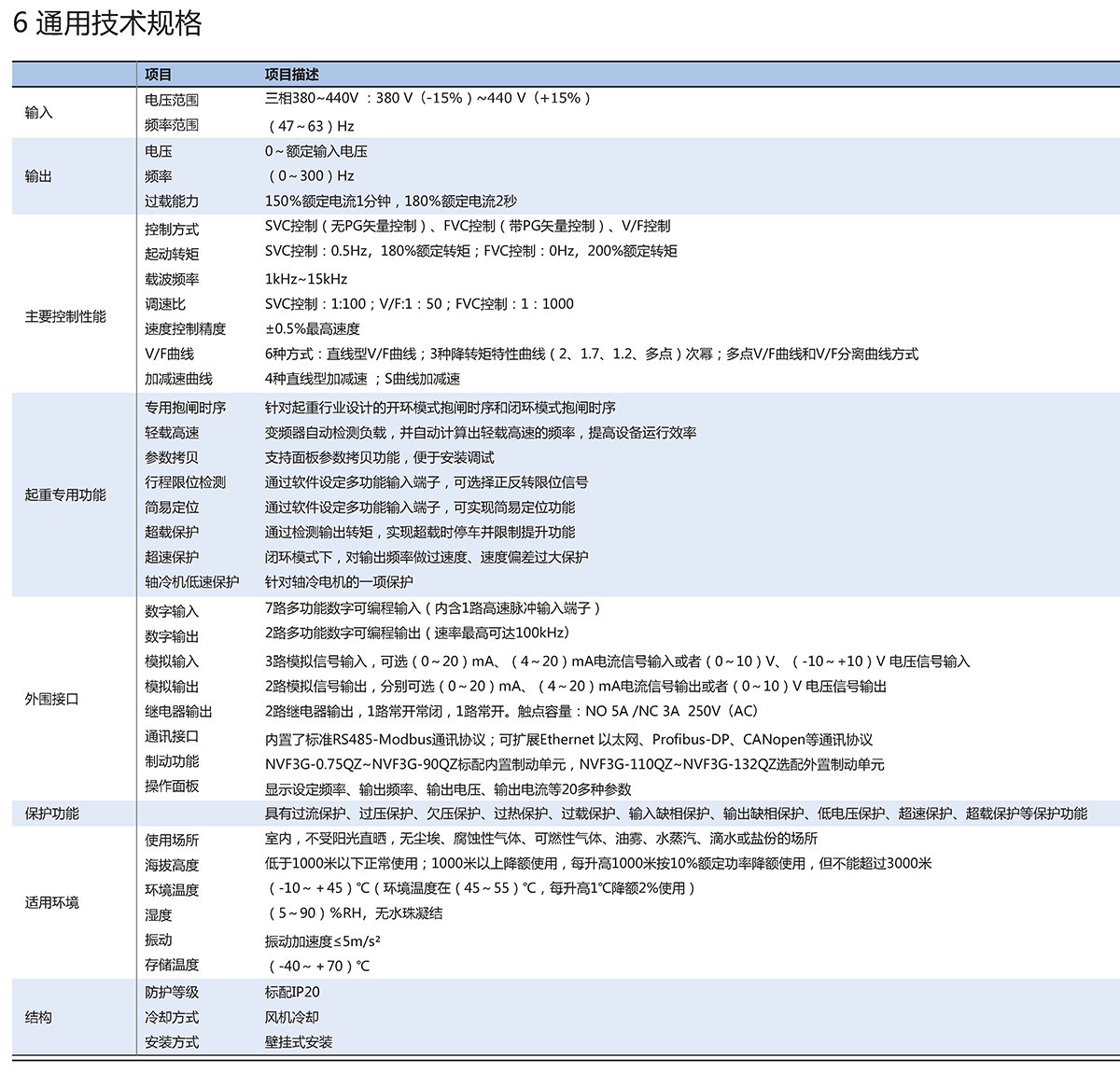 NVF3G-QZ系列产品是本公司针对起重行业应用特性及控制要求专门设计的起重专用变频器,采用了先进的矢量控制技术和转矩控制技术,具有负载动态响应快、低频力矩大、过载能力强等特点,并融合了丰富的起重专用功能:如专用抱闸逻辑、行程限位检测、简易定位功能、超载保护、轻载增速、低电压保护等,适用于起重设备中的提升、平移、回转等应用场合。