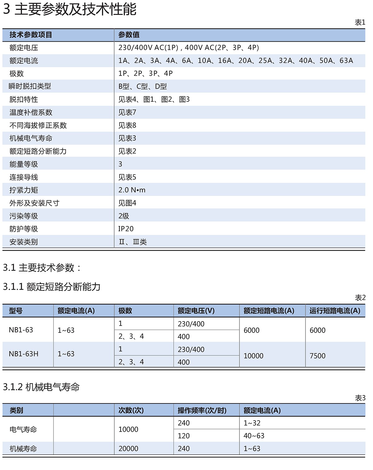 NB1-63□小型断路器适用于交流50Hz额定电压230/400V,额定电流至63A的线路中,作过载和短路保护之用,正常情况下作为线路的不频繁操作转换之用,也可作为断开线路进行线路及设备维修的隔离开关使用。