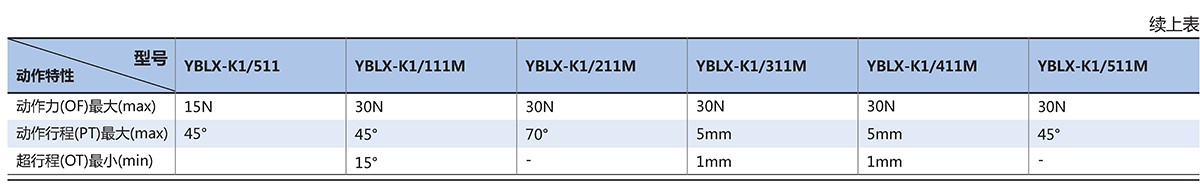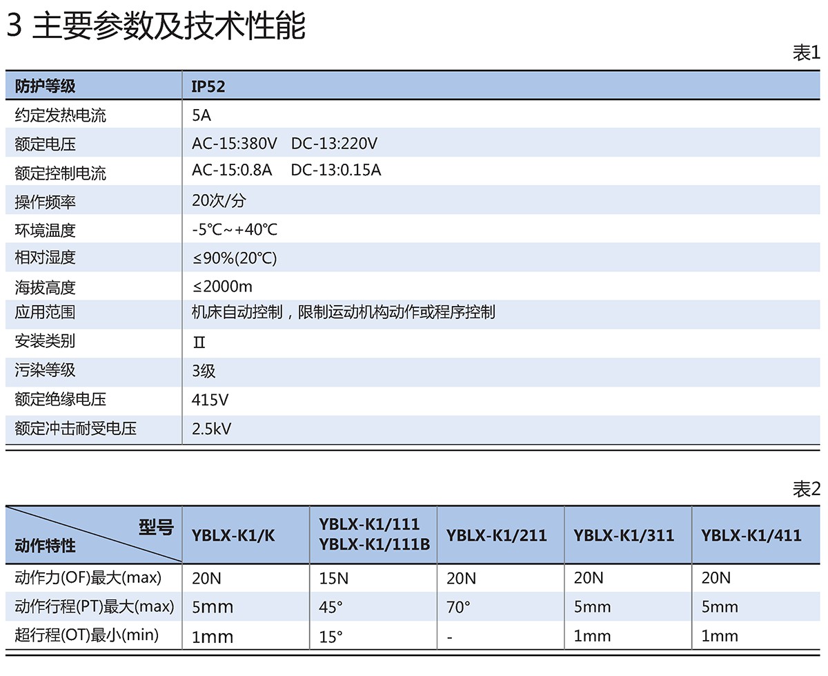 YBLX-K1系列行程开关适用于交流(50~60)Hz,Ue:380V Ie:0.8A 直流 Ue:220VIe:0.15A及以下的电气线路中,作运动机构的行程控制、运动方向或速度的变换、机床的自动控制、运动方向或速度的变换、机床的自动控制、运动机构的限位动作及控制行程或程序之用。