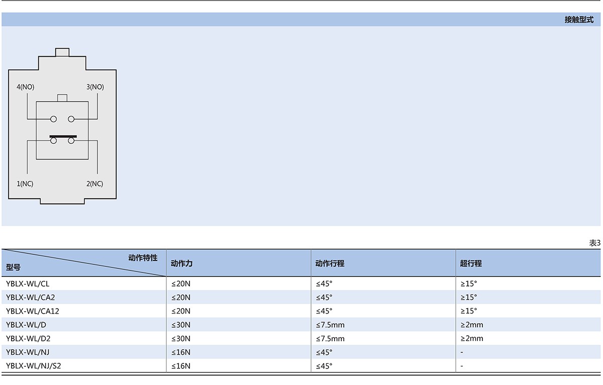 YBLX-WL行程开关(以下简称开关)主要用于交流(50~60)Hz,Ue:380V,直流Ue:220V及以下的电气线路中,作运动机构的行程控制、运动方向或速度的变换、机床的自动控制、运动机构的限位动作及控制行程或程序之用。