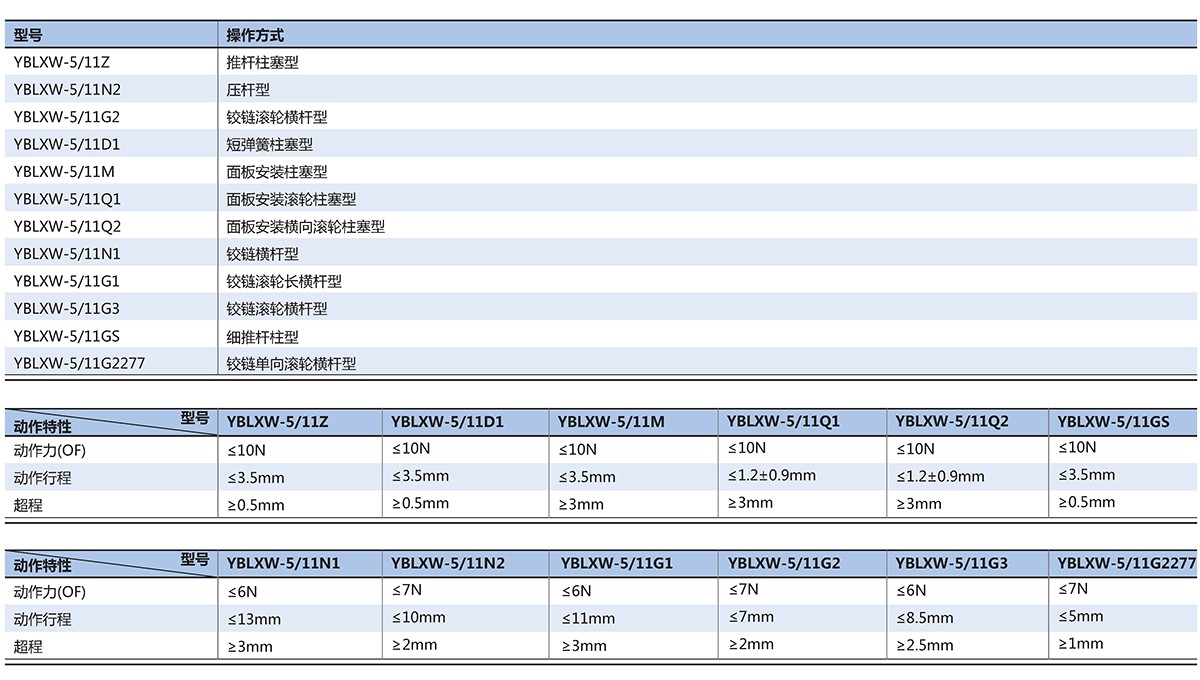 YBLXW-5系列微动开关,适用于交流50Hz~60Hz,电压380V及以下,直流220V及以下的控制电路中,作机械、纺织、轻工、电子仪器等各种机械设备的行程控制,限位保护及联锁之用。
